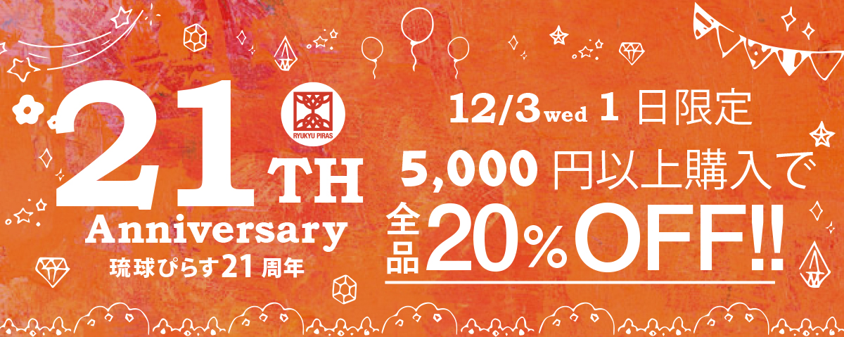 - 2024年12月3日お知らせ皆様のおかげで琉球ぴらすは20周年を迎えることができました。誠にありがとうございます。これまで同様ご愛顧賜りますようお願い申し上げます。
